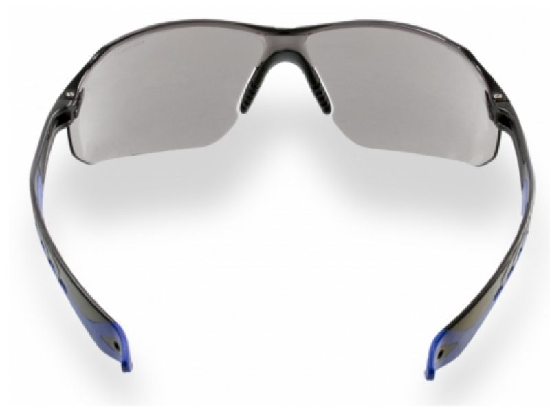 Óculos de segurança, constituídos de armação e QUALIFLEXr confeccionado em uma única peça de policarbonato incolor, amarelo, verde, cinza, marrom, incolor com revestimento externo de filme prateado (incolor espelhado-I/O), cinza com revestimento externo de filme prateado (cinza espelhado) com dois pinos localizados na posição do nariz, utilizados para encaixe do apoio nasal (silicone) maleável, incolor ou preto e hastes tipo espátula. As hastes são confeccionadas de material plástico preto e azul e são fixadas às extremidades do QUALIFLEXr através de um parafuso metálico.