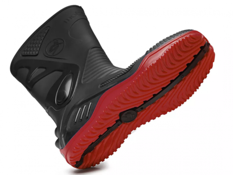 Antiderrapante especial e reforçado com ranhuras de 4 a 5 mm na planta e no salto (boa tração, retarda a passagem de temperaturas e não impede o fluxo de líquidos); contém polímero plástico em pvc, reforçado com massa nitrílica (toque emborrachado, melhora o grippe, melhora a resistência a abrasão, impede o ressecamento e trincas e minimiza . Interior: forrado (forro em poliéster);