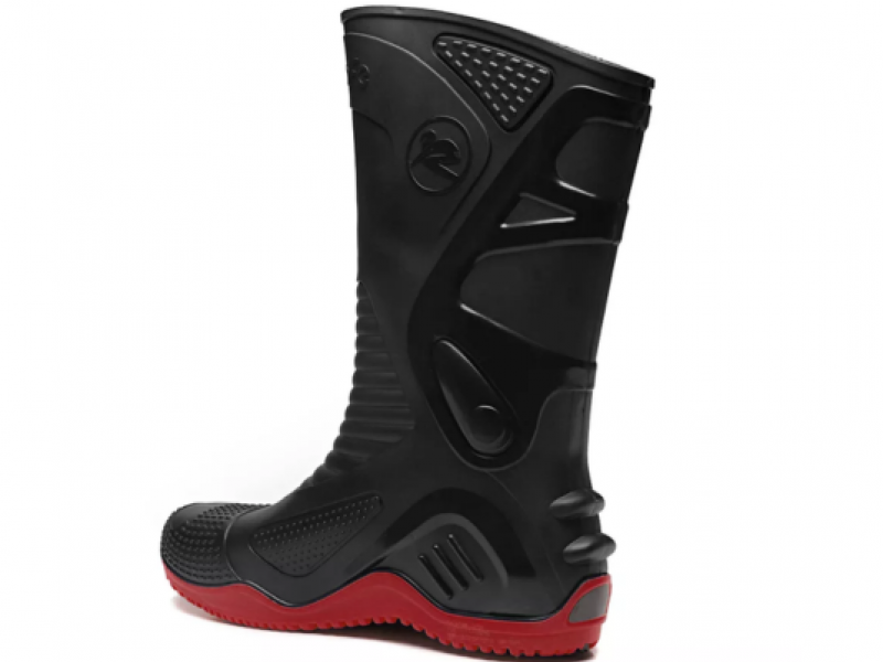 Espessura 2,0 mm na borda superior do cano, aumentando gradativamente chegando a 2,5 mm na altura do tornozelo e 3,5 mm na união do cano com a sola; reforço lateral para proteção, Nos tornozelos; estrias horizontais que facilitam o calçar: contém polímero plástico em pvc e massa nitrílica (toque emborrachado, melhora o grippe, melhora a resistência a abrasão, impede o ressecamento e trincas e minimiza a agressão do sangue).