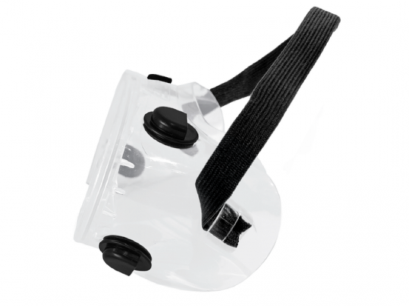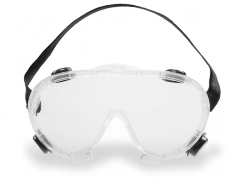 Óculos de segurança, modelo ampla-visão, constituídos de armação confeccionada em uma única peça de PVC flexível transparente, com ventilação indireta,composta de duas válvulas localizadas na parte superior e duas válvulas localizadas na parte inferior da armação e lente de policarbonato incolor. O ajuste à face do usuário é feito por meio de um tirante elástico. Os óculos cobrem toda a região em torno dos olhos do usuário.